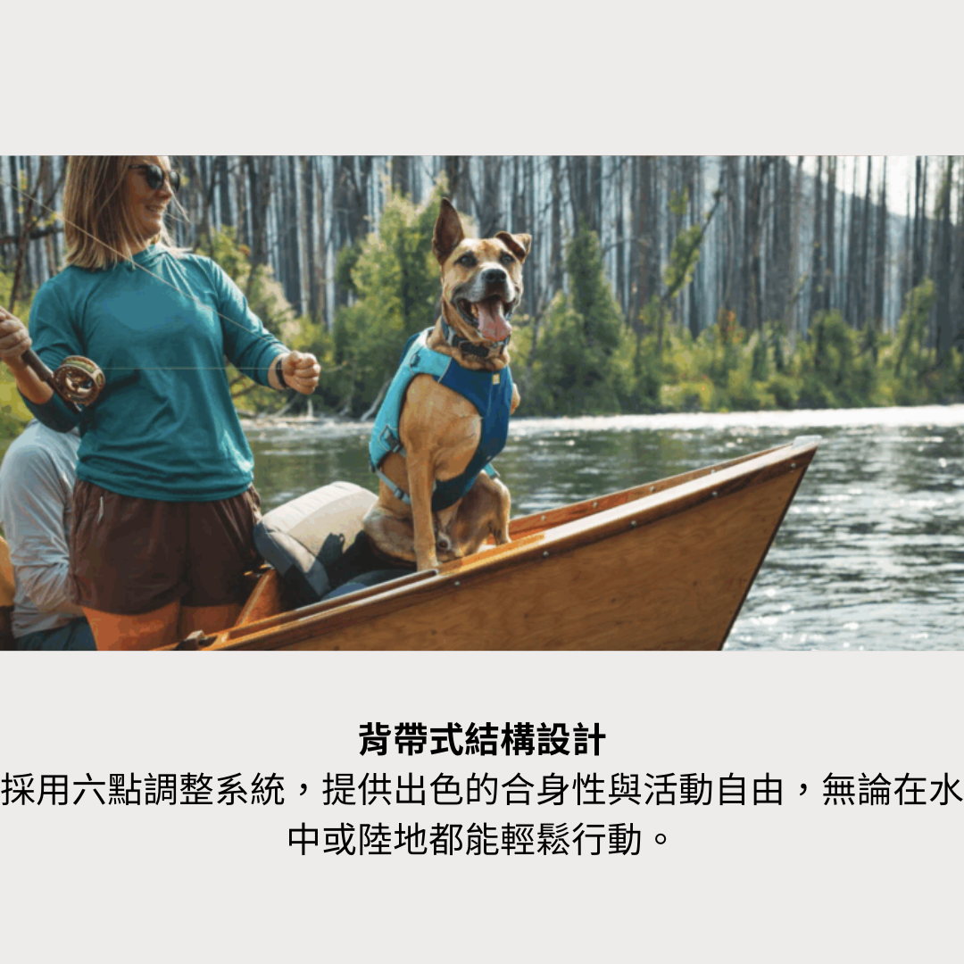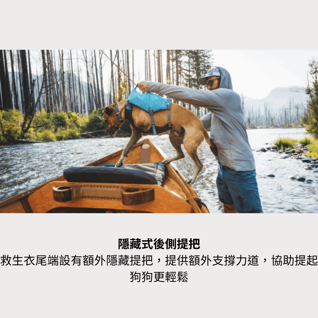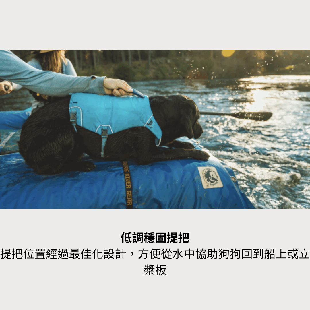 泡棉結構經過精準配置,提供最佳浮力,幫助狗狗維持自然的游泳姿勢。低調穩固的主提把便於協助狗狗平衡上船,後方還設有隱藏式輔助提把,在需要額外支援時可輕鬆提起。