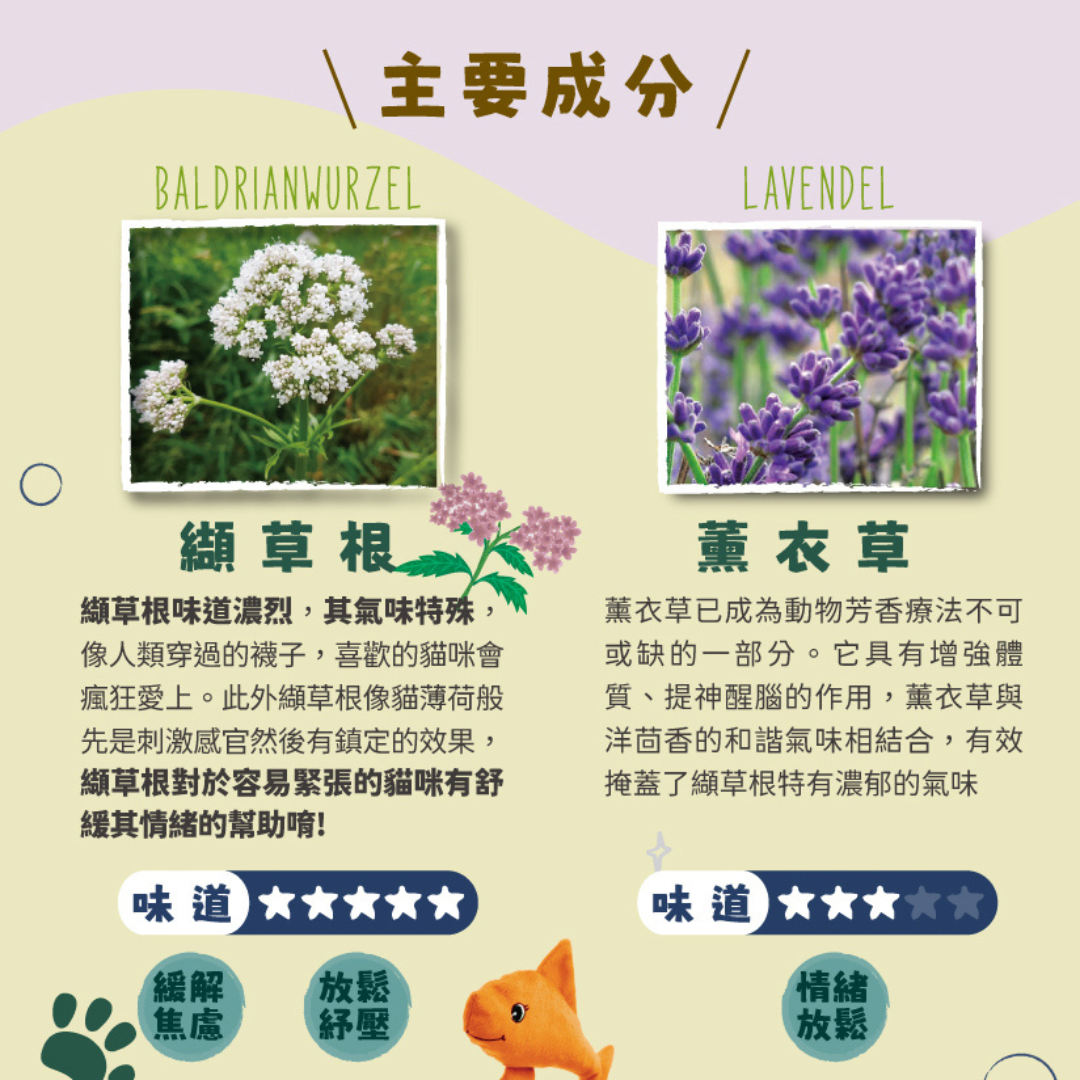 此外纈草根像貓薄荷般先是刺激感官然後有鎮定的效果,纈草根對於容易緊張的貓咪有舒緩其情緒的幫助唷!